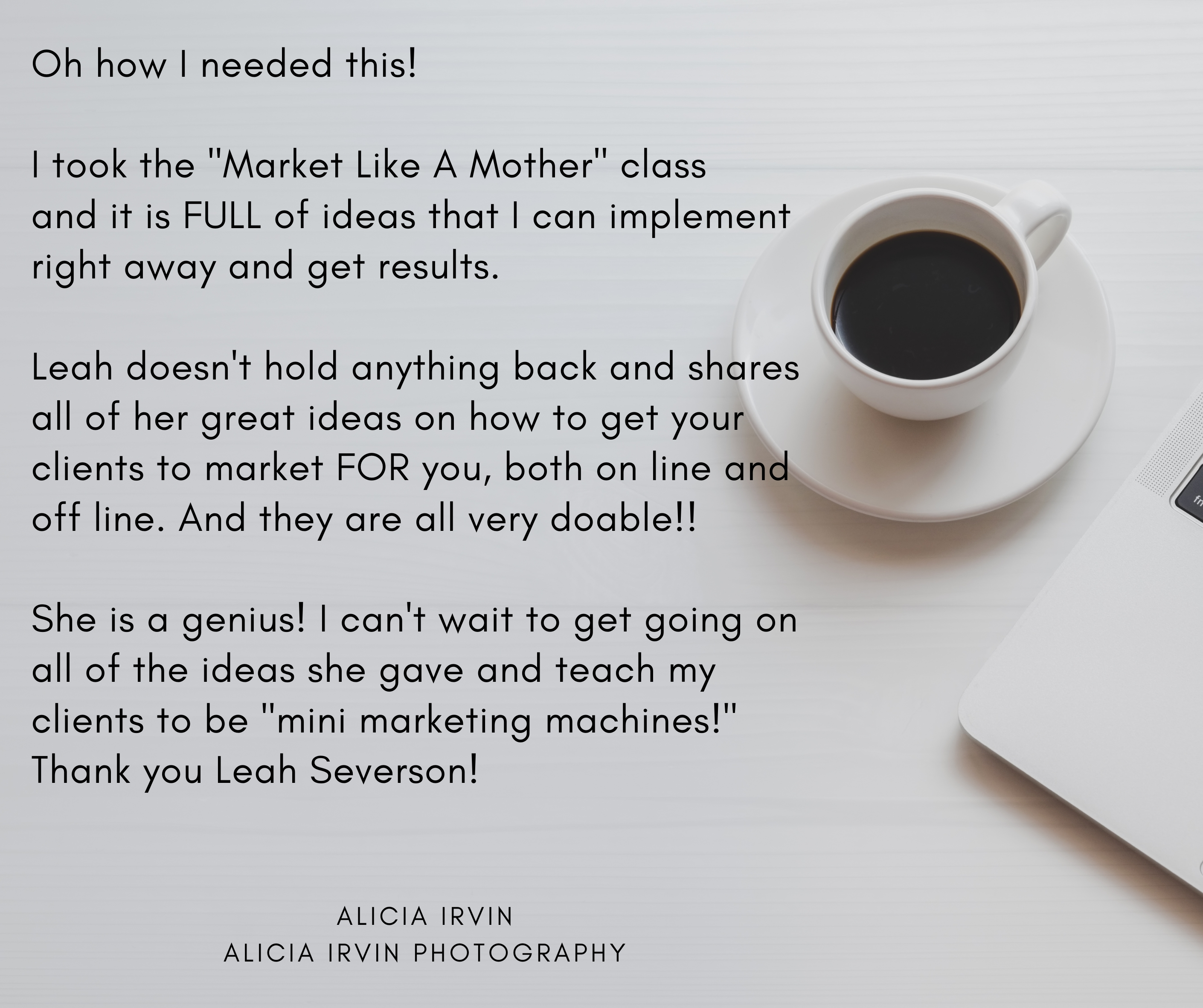 In my "Market Like a Mother" class you'll learn all the best ways to get your clients to market your business for you, in a way that feels great for everyone!